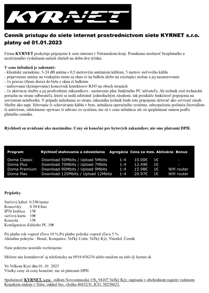 Cennik KYRNET s.r.o. platny od 1.1.2023